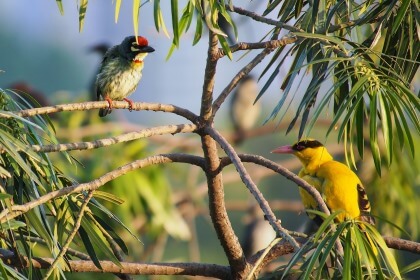 大きな木にとまる小鳥たち。