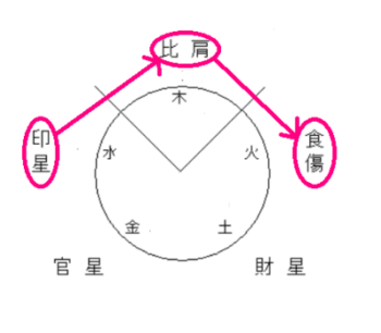 食神と偏印は相性が悪いため、互いの良さを打ち消し合っているのですが、人生全般として見ると悪いばかりの命式ではありません。食神は天干星の中でも唯一「神」がつく、衣食住に困らない星です。下記の五行図を見ると「比肩」から「食傷」へ矢印の向く方向へ気が流れます。自分自身である比肩から食神へ気が注がれるため、食神は自分から生み出されるものを表します。それらが偏印によって尅されると見るのが倒食ですが、尅されたからと食神自体がすべて消えて無くなることはないのです。
